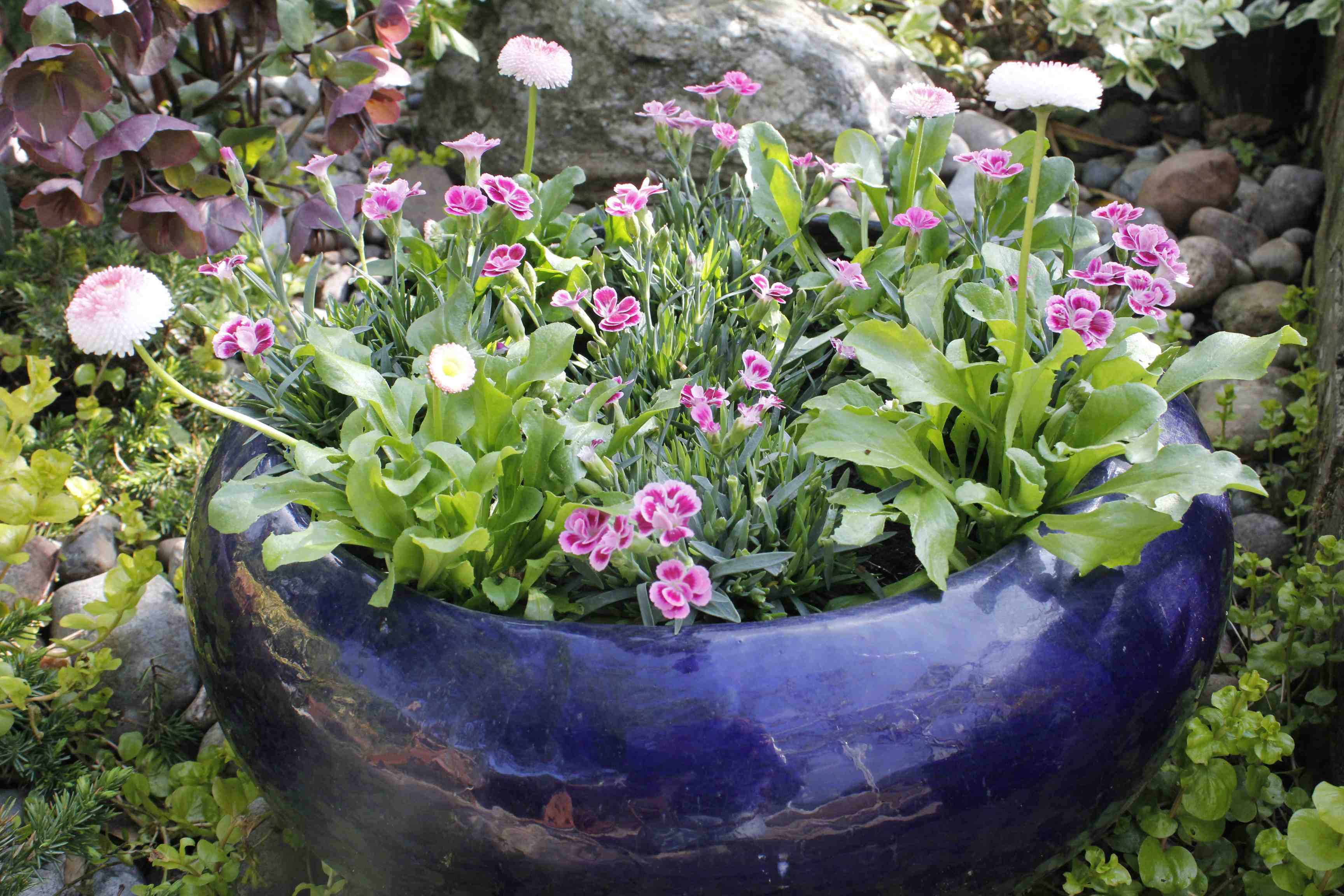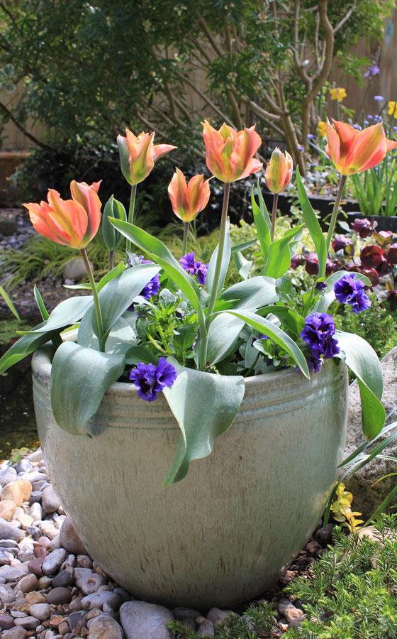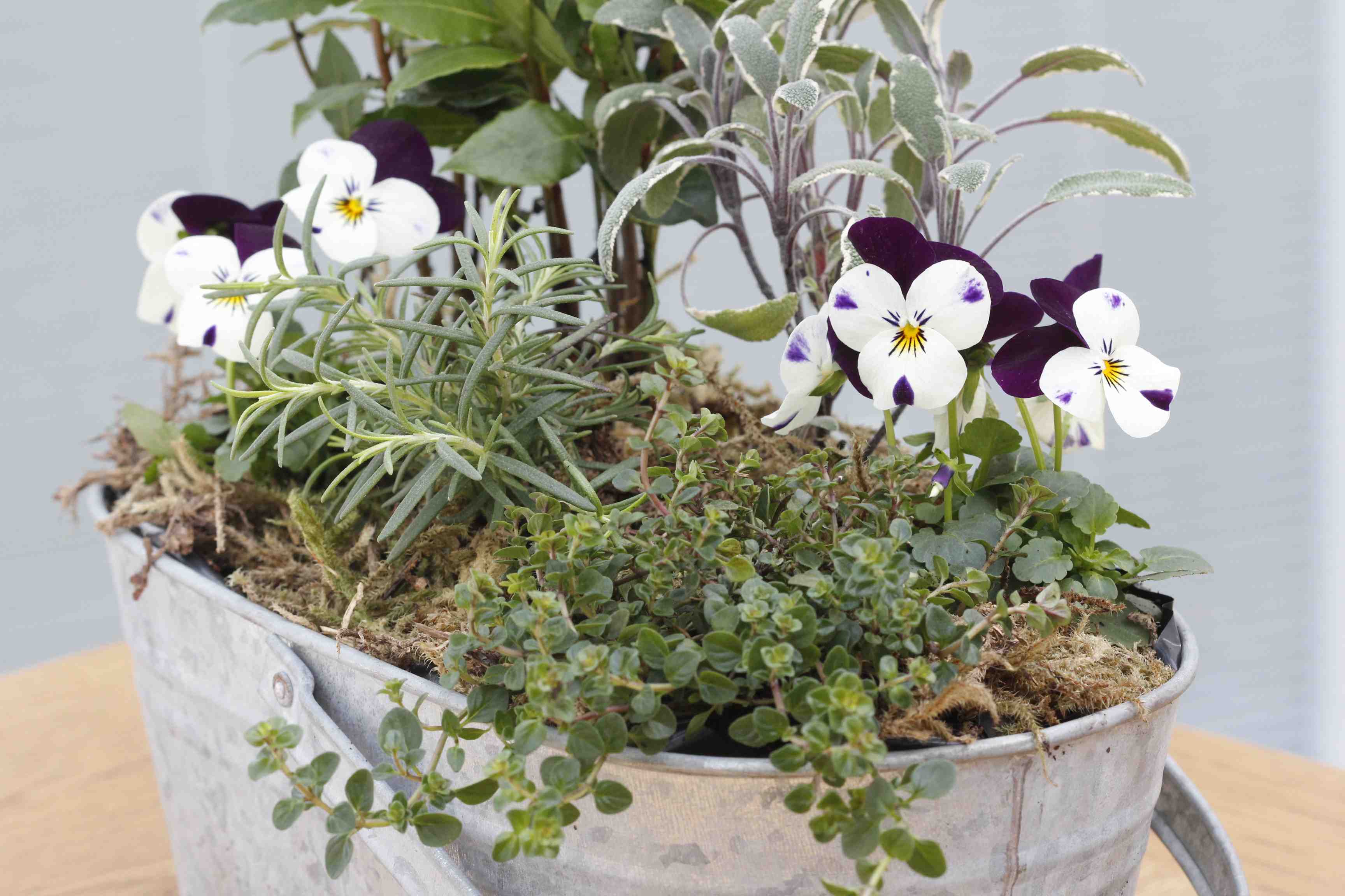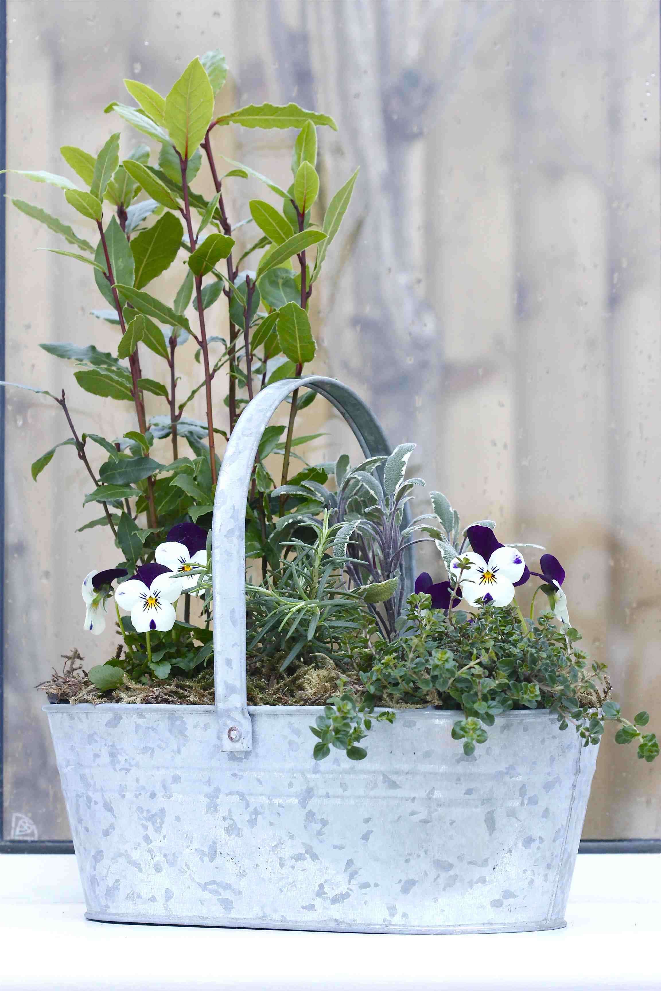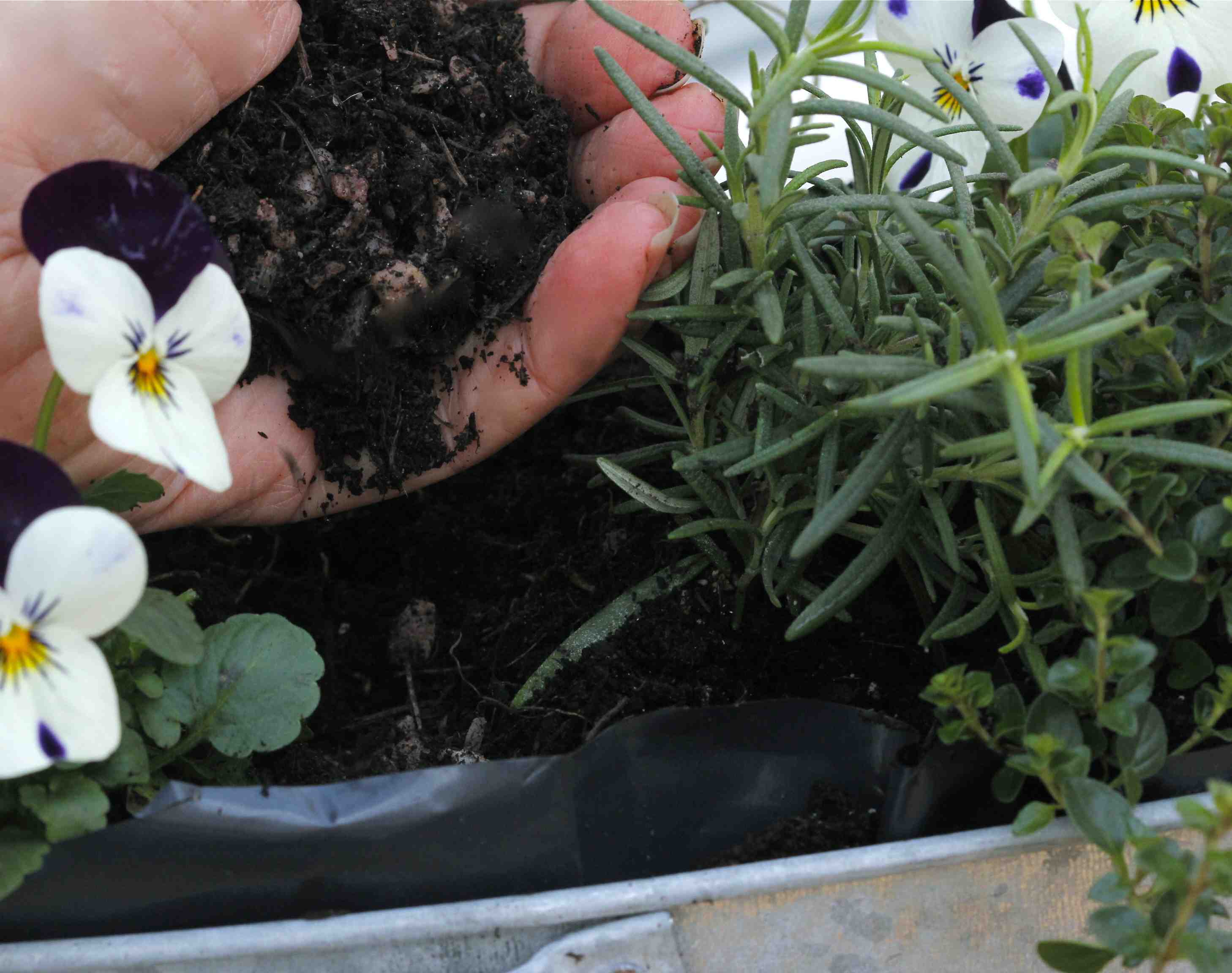Plant your herbs and violas – the flowers will add colour to your display and the little flowers are edible too. Fill in between the plants with a mix of compost and grit, and firm gently.