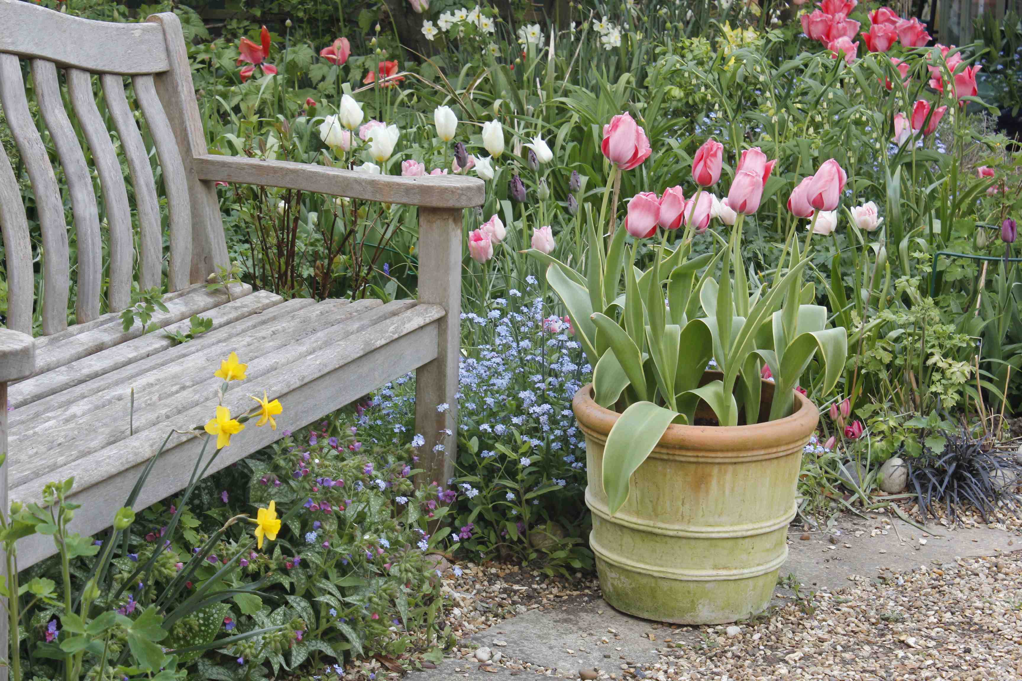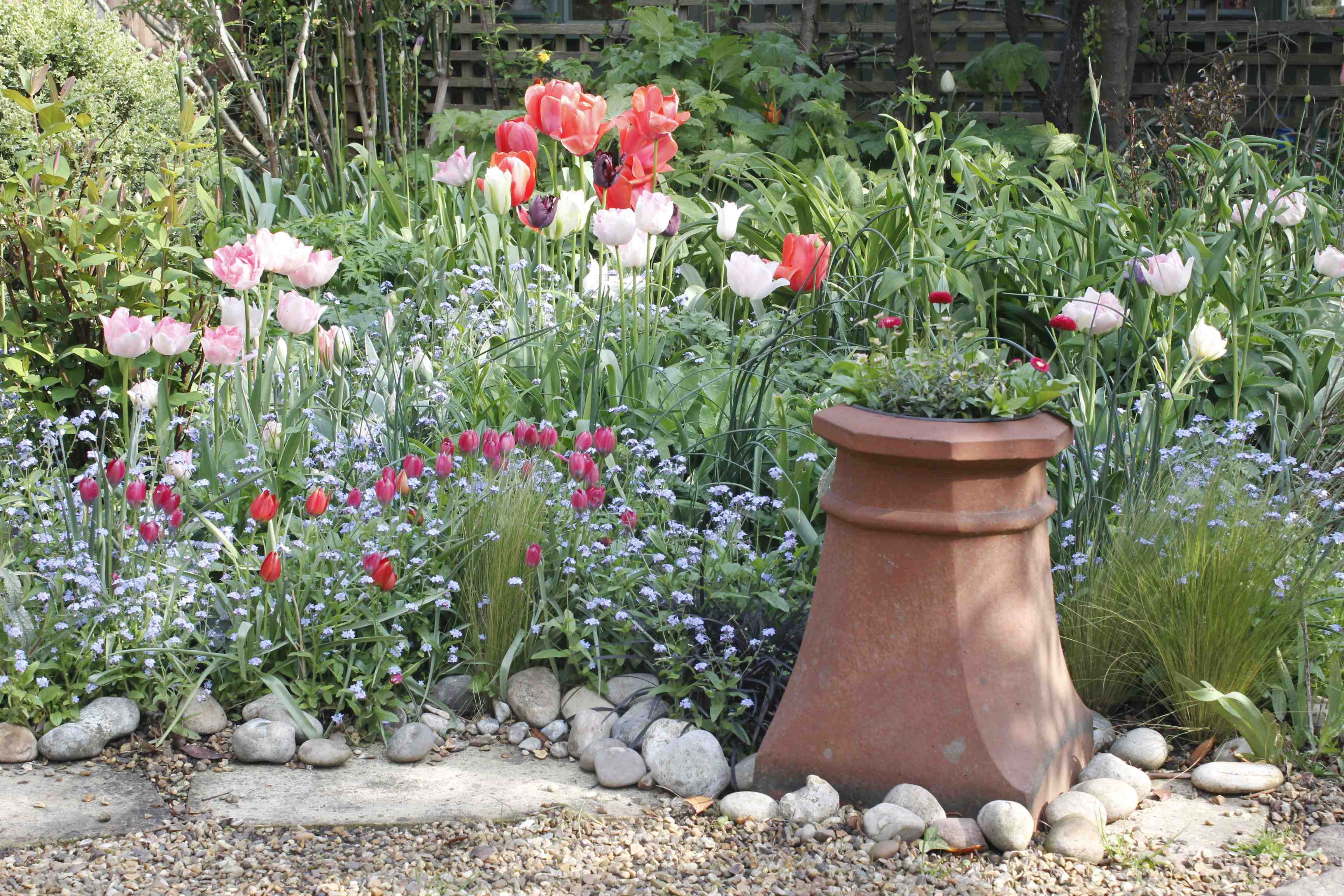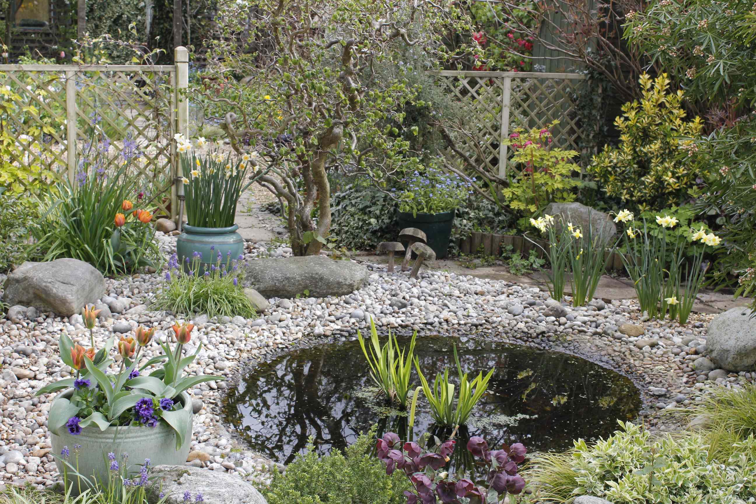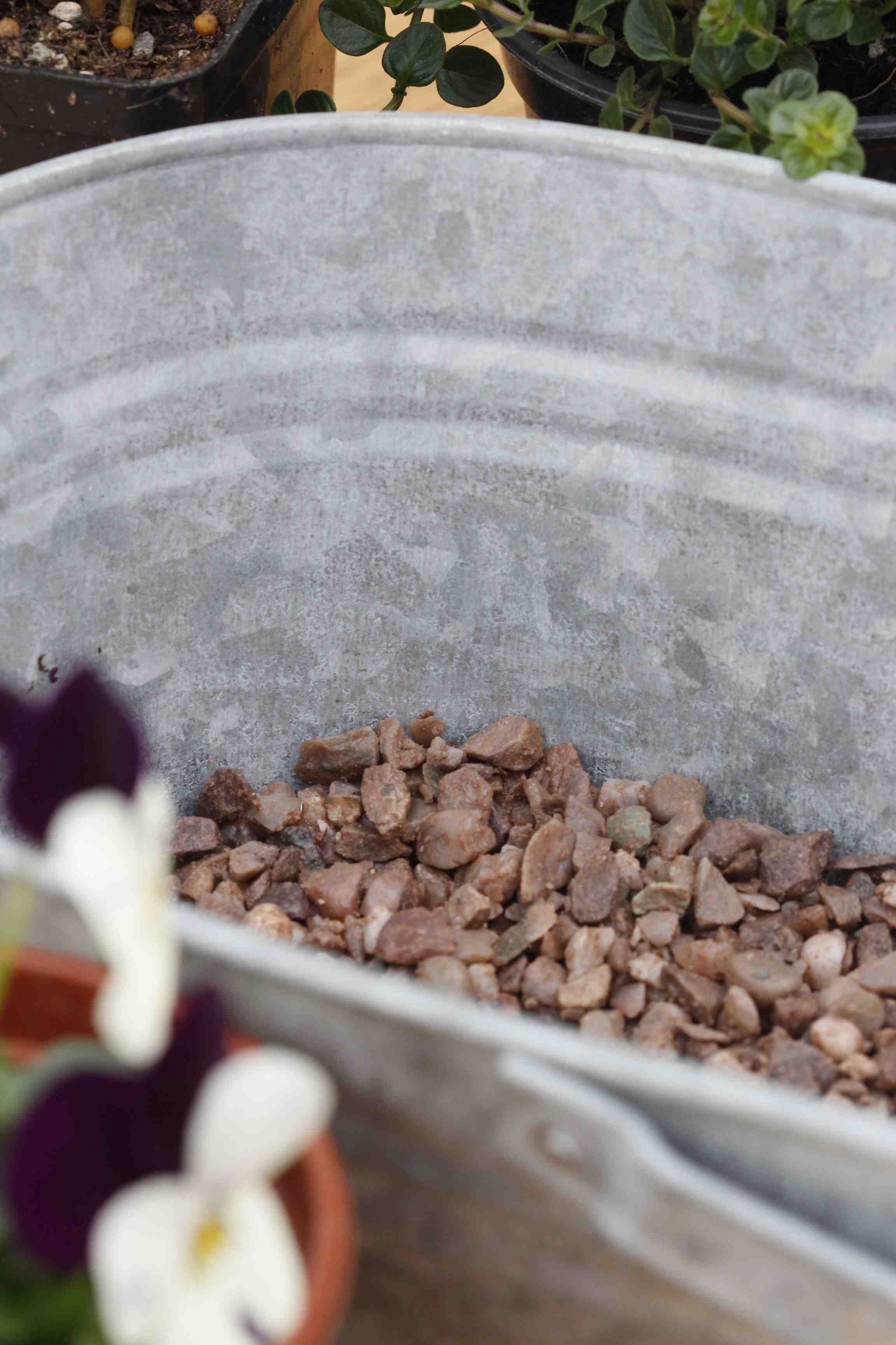 Cut off the bottom section of a black plastic bin liner and use it to line the container, trimming off the excess but leaving a couple of centimetres above the rim. Punch a few drainage holes in the plastic liner with scissors. Then add a thin layer of compost mixed with horticultural grit.